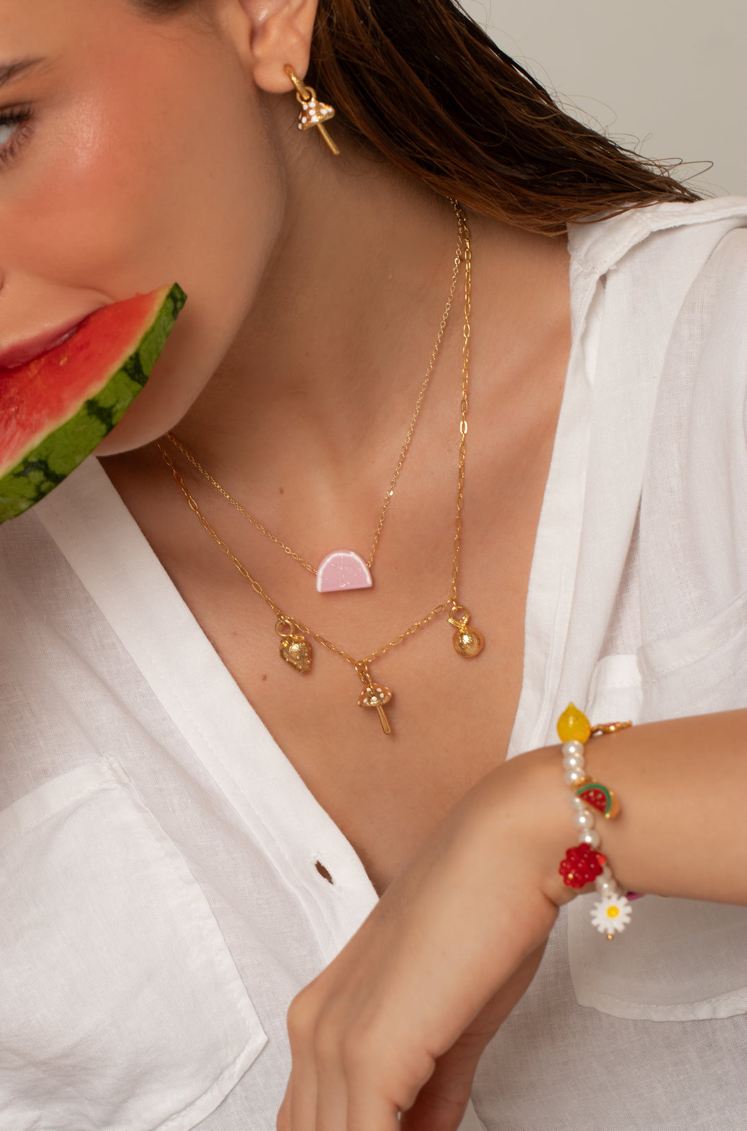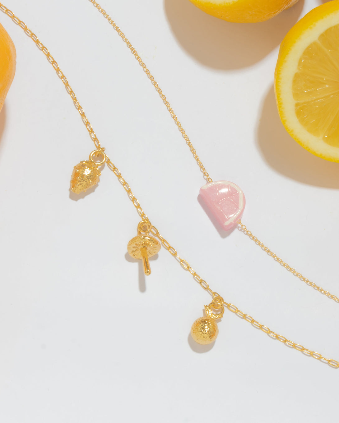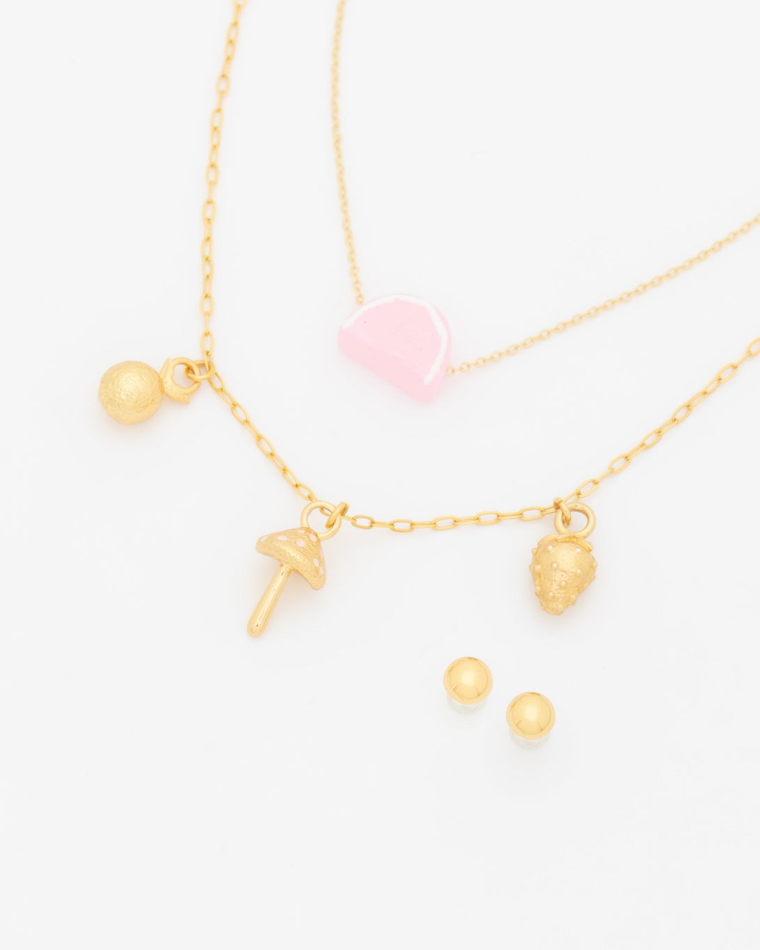 - Dijes del collar en Zamak (aleación de metales) con baño de oro de 24k.