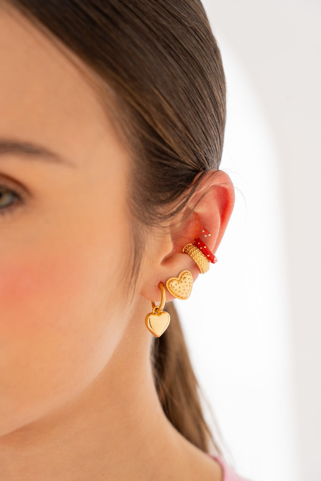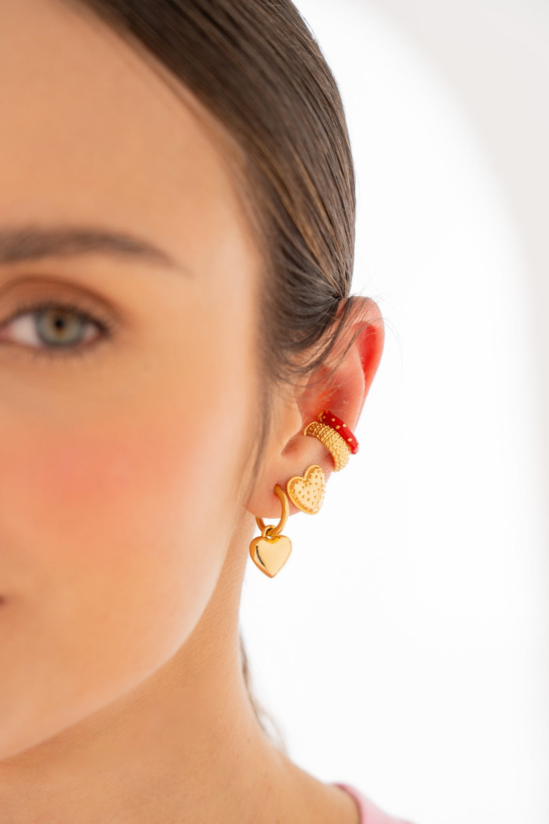 - Incluye: 1 par de candongas 2 en 1 corazón , 1 par de topos corazón y 2 earcuff.